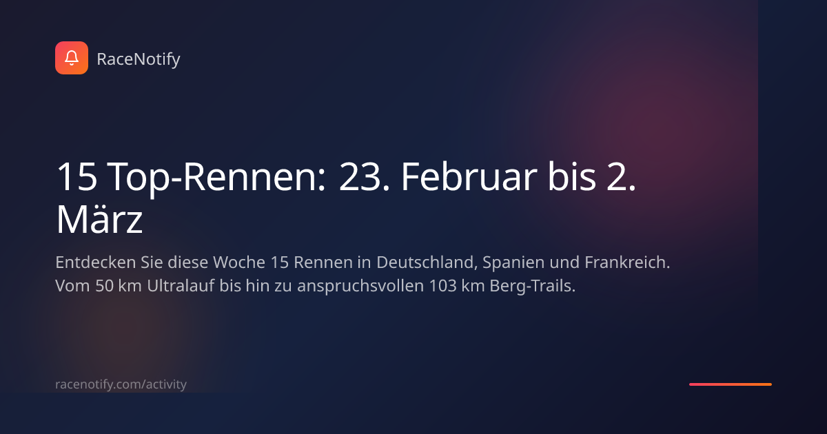Die Rennsaison nimmt Fahrt auf! In dieser Woche erwarten uns 15 spektakuläre Events in Deutschland, Spanien und Frankreich. Mit 12 Trail-Rennen und 3 Straßenläufen ist für jeden Sportler etwas dabei – vom explosiven 5-km-Nachtlauf bis hin zum atemberaubenden Berg-Ultra.