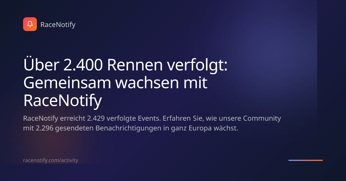 Es war eine unglaubliche Reise, das Wachstum für unsere ersten Nutzer zu beobachten. Wir sind stolz darauf, dass RaceNotify inzwischen einen Meilenstein von insgesamt 2.429 Veranstaltungen in unserem System erreicht hat. Unsere Mission war schon immer einfach: sicherzustellen, dass Sie nie einen Anmeldetermin verpassen. Bis heute haben wir 2.296 Benachrichtigungen an Athleten gesendet, die bereit für ihre nächste Herausforderung sind. 🏃♂️