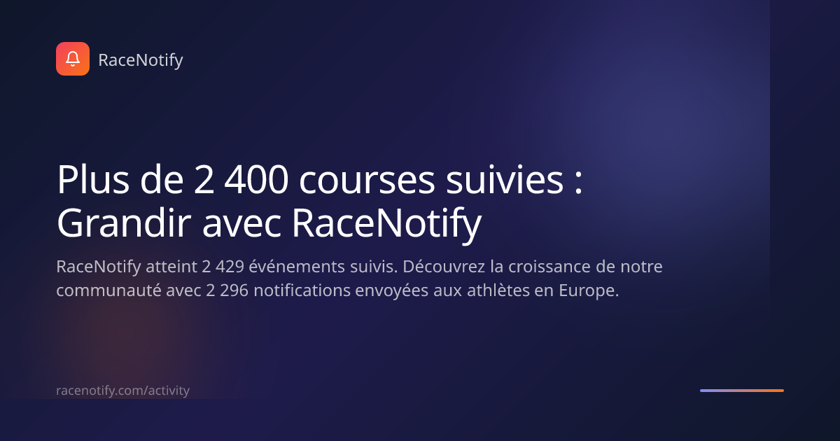C'est un voyage incroyable de voir nos premiers utilisateurs s'épanouir. Nous sommes fiers de partager que RaceNotify a atteint le cap des 2 429 événements au total dans notre système. Notre mission a toujours été simple : s'assurer que vous ne manquiez jamais une date d'inscription. À ce jour, nous avons envoyé 2 296 notifications à des athlètes prêts à relever leur prochain défi. 🏃♂️