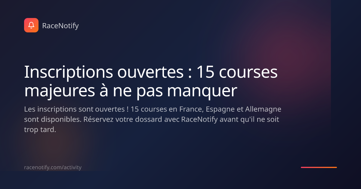 Ne perdez pas une seconde ! Cette semaine est cruciale pour votre calendrier de courses avec l'ouverture des inscriptions pour 15 événements majeurs à travers l'Europe. Que vous soyez adepte du bitume à Newcastle ou des sentiers techniques en Allemagne et en Espagne, les places s'envolent rapidement. RaceNotify a envoyé des notifications dès l'ouverture des formulaires : c'est le moment d'agir. 🏃♂️