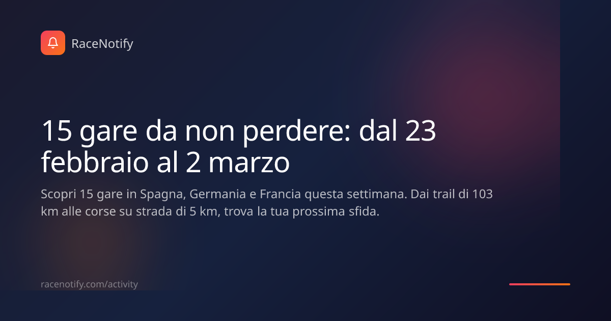 I posti finiscono in fretta! RaceNotify invia notifiche istantanee per avvisarti non appena aprono le iscrizioni. Non perdere l'occasione di partecipare alla tua gara preferita e assicurati un posto in griglia! 🏃♂️