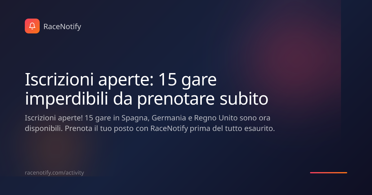 Non perdere tempo! Questa settimana è stata fondamentale per il calendario podistico europeo, con l'apertura delle iscrizioni per 15 eventi imperdibili. Dalle strade veloci di Newcastle ai sentieri impegnativi della Germania e della Spagna, i posti stanno scomparendo rapidamente. RaceNotify notifica gli atleti nel momento esatto in cui aprono i portali: è ora di agire. 🏃♂️